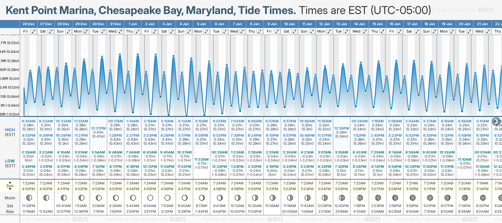December and January Tide charts for Kent Point Marina, Chesapeake Bay: The tide charts below show the height, time and date of high and low tides for the next 30 days.