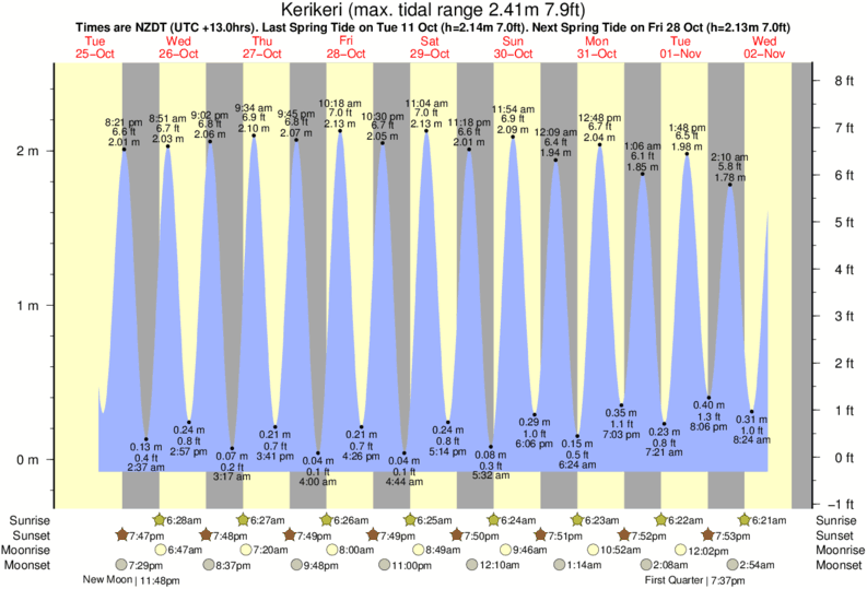 Tide chart for KerikeriShowing low and high tide times for the next 30 days at Kerikeri. Tide Times are NZDT (UTC +13.0hrs).