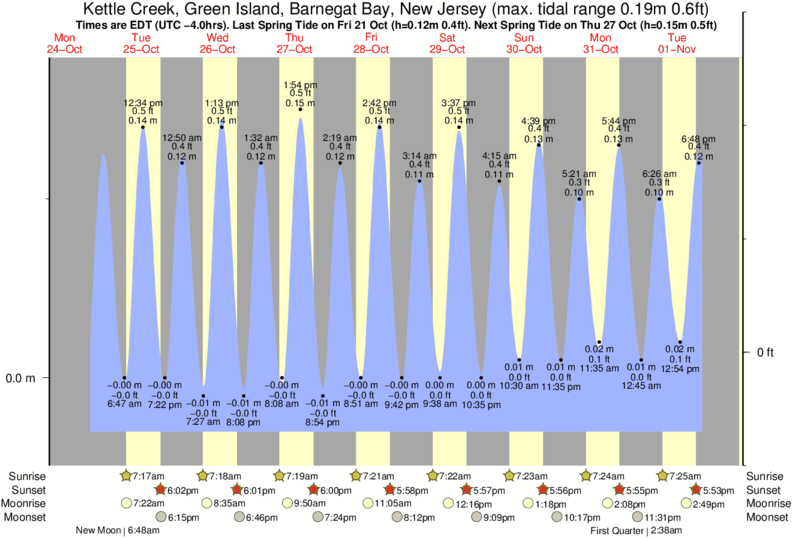 Kettle Creek, Green Island, Barnegat Bay tide chart key: The tide chart above shows the height and times of high tide and low tide for Kettle Creek, Green Island, Barnegat Bay, New Jersey. The grey shading corresponds to nighttime hours between sunset and sunrise at Kettle Creek, Green Island, Barnegat Bay.