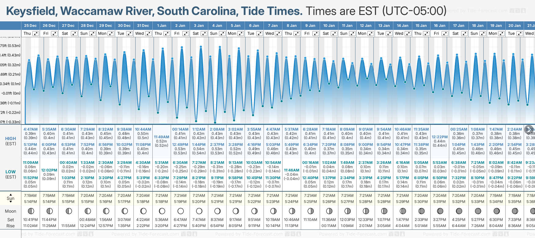 December and January Tide charts for Keysfield, Waccamaw River: The tide charts below show the height, time and date of high and low tides for the next 30 days.