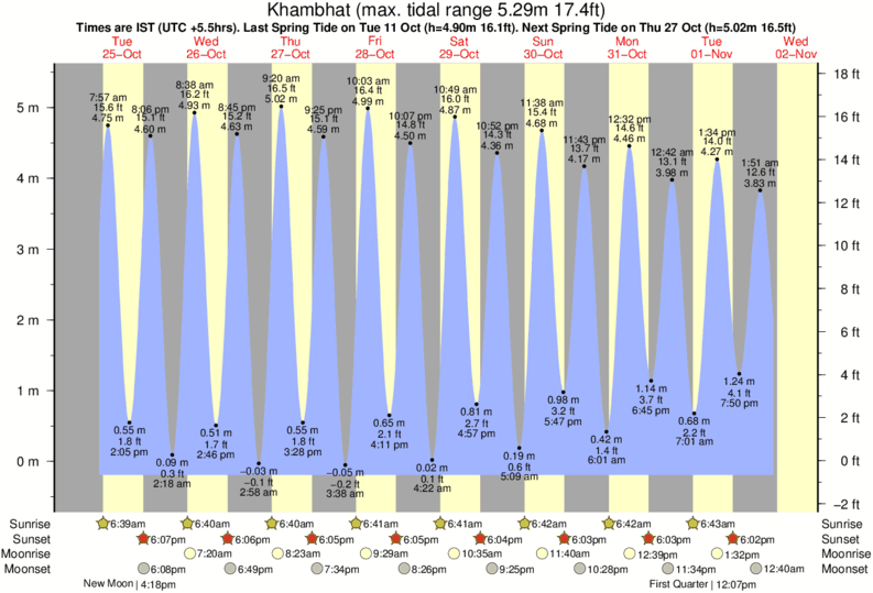 Tide Times are IST (UTC +5.5hrs). Last Spring High Tide at Khambhat was on Sat 06 Dec (height: 5.06m 16.6ft). Next high Spring Tide at Khambhat will be on Tue 23 Dec (height: 4.70m 15.4ft).
