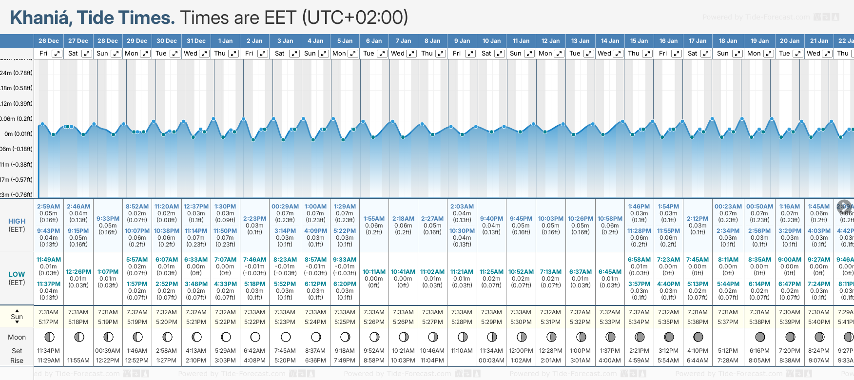 December and January Tide charts for Khaniá: The tide charts below show the height, time and date of high and low tides for the next 30 days.