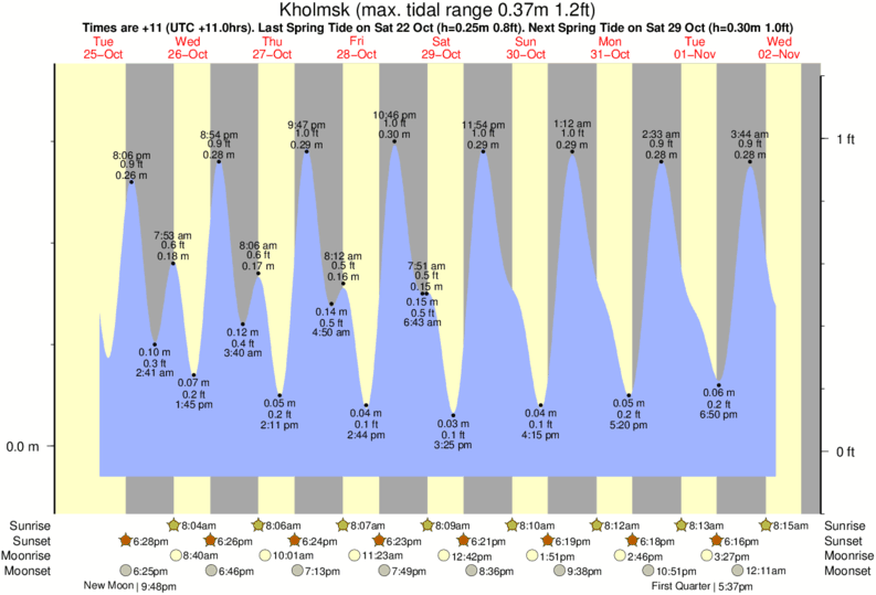 Tide chart for KholmskShowing low and high tide times for the next 30 days at Kholmsk. Tide Times are +11 (UTC +11.0hrs).