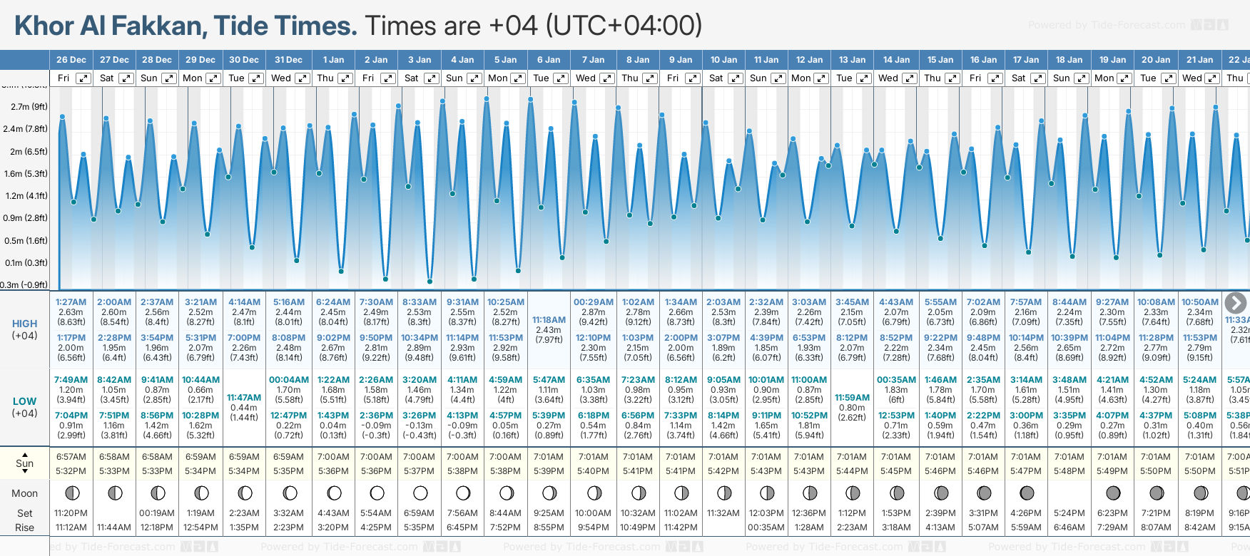 December and January Tide charts for Khor Al Fakkan: The tide charts below show the height, time and date of high and low tides for the next 30 days.