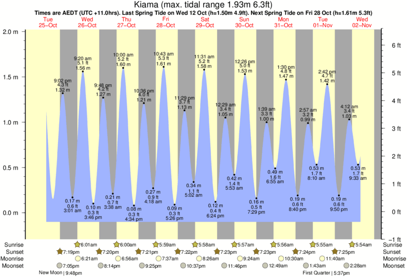 Tide Times are AEDT (UTC +11.0hrs). Last Spring High Tide at Kiama was on Sat 06 Dec (height: 1.80m 5.9ft). Next high Spring Tide at Kiama will be on Sun 21 Dec (height: 1.54m 5.1ft).