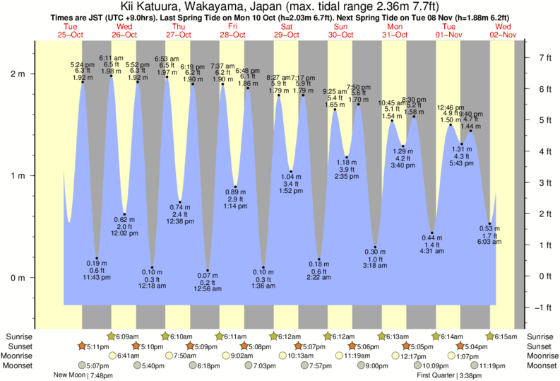 Tide Times are JST (UTC +9.0hrs). Last Spring High Tide at Kii Katuura was on Sun 07 Dec (height: 1.85m 6.1ft). Next high Spring Tide at Kii Katuura will be on Sun 21 Dec (height: 1.67m 5.5ft).