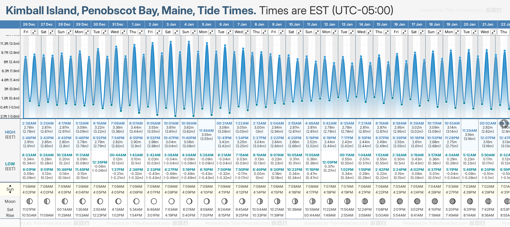 December and January Tide charts for Kimball Island, Penobscot Bay: The tide charts below show the height, time and date of high and low tides for the next 30 days.