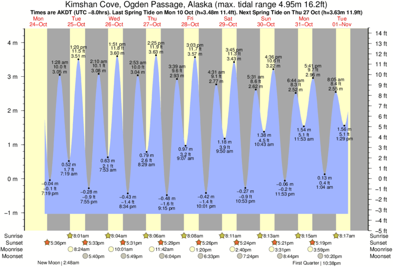 Tide Times are AKST (UTC -9.0hrs). Last Spring High Tide at Kimshan Cove, Ogden Passage was on Fri 05 Dec (height: 3.98m 13.1ft). Next high Spring Tide at Kimshan Cove, Ogden Passage will be on Sat 20 Dec (height: 3.38m 11.1ft).