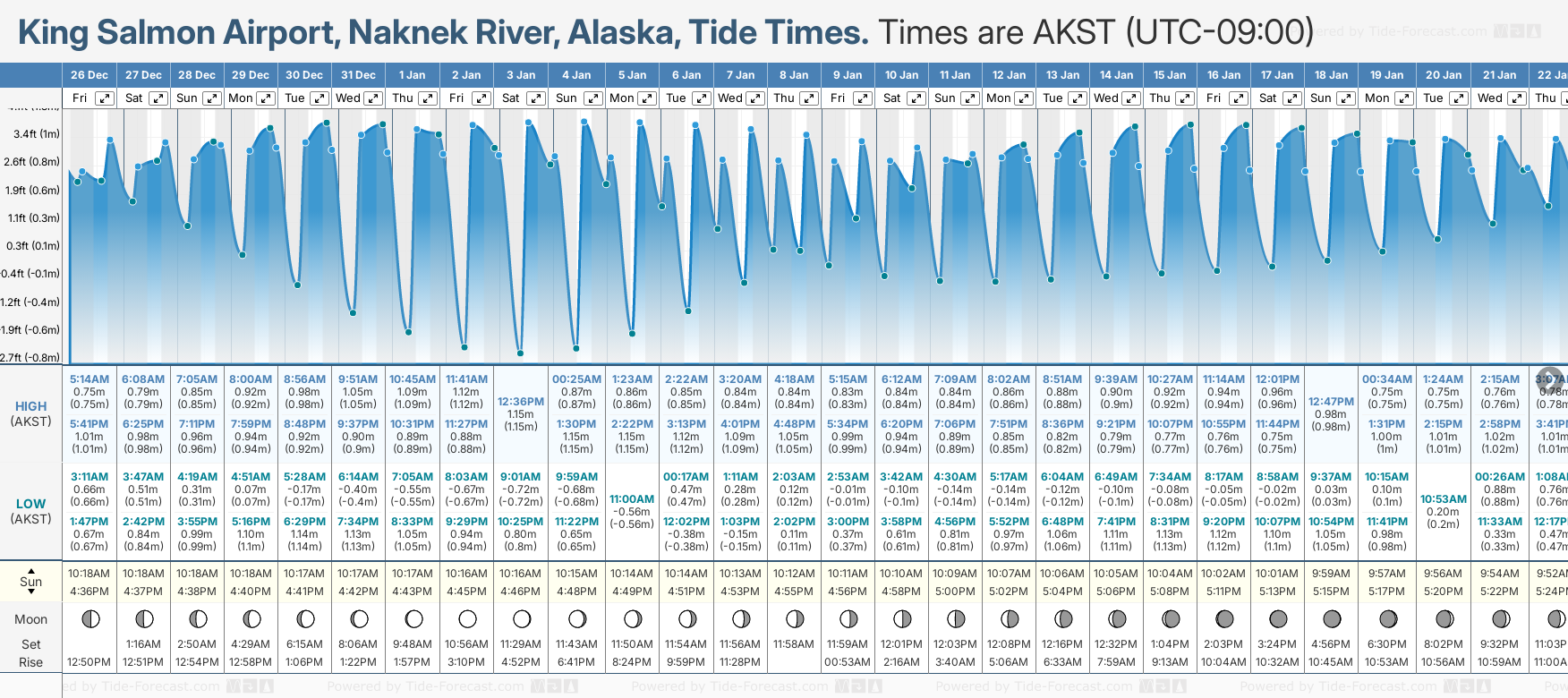 December and January Tide charts for King Salmon Airport, Naknek River: The tide charts below show the height, time and date of high and low tides for the next 30 days.