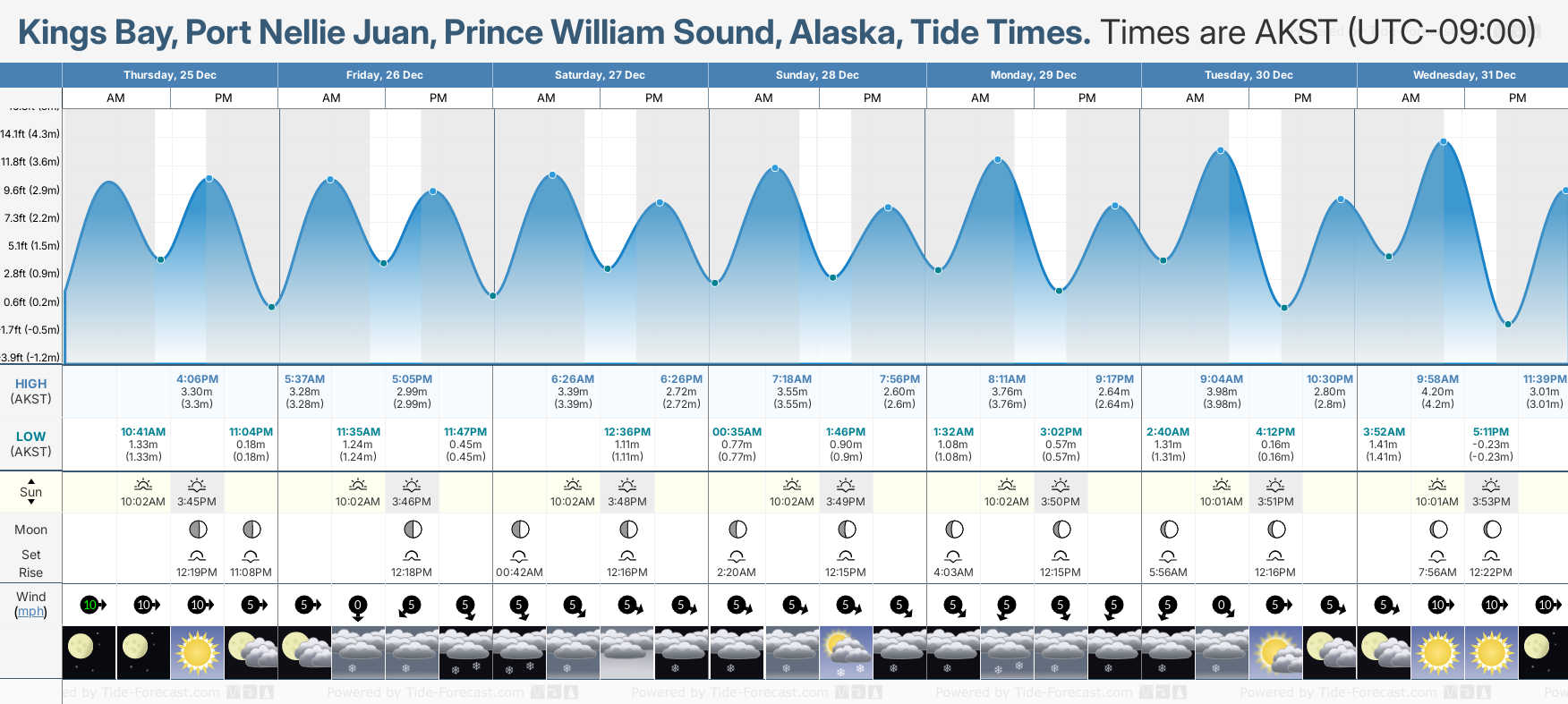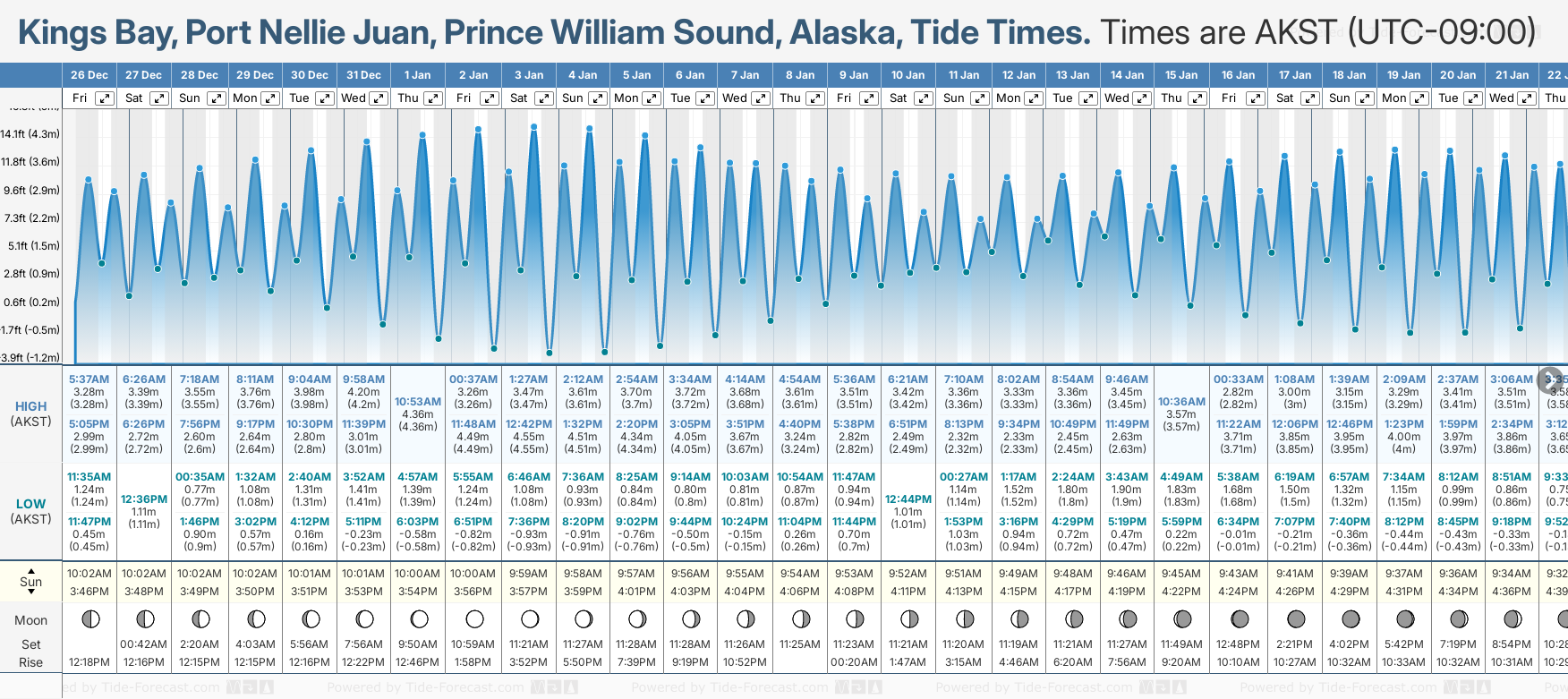 December and January Tide charts for Kings Bay, Port Nellie Juan, Prince William Sound: The tide charts below show the height, time and date of high and low tides for the next 30 days.