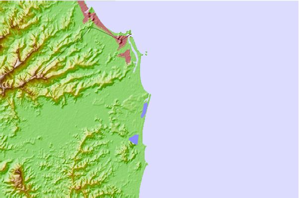Use this relief map to navigate to tide stations, surf breaks and cities that are in the area of Kingscliff, Australia.