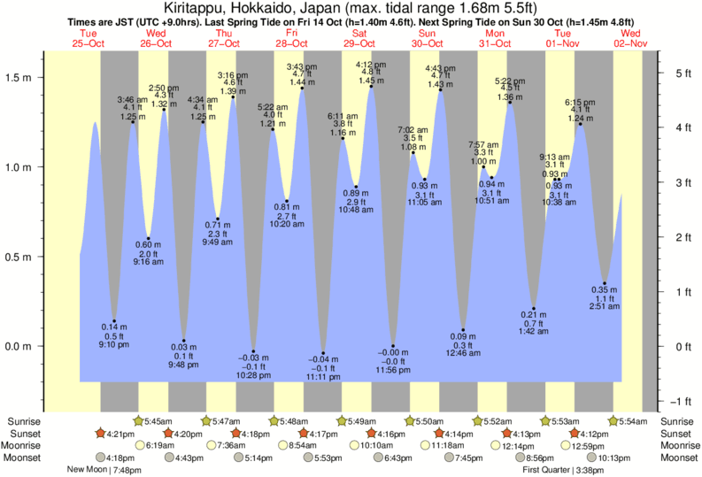Tide chart for KiritappuShowing low and high tide times for the next 30 days at Kiritappu. Tide Times are JST (UTC +9.0hrs).
