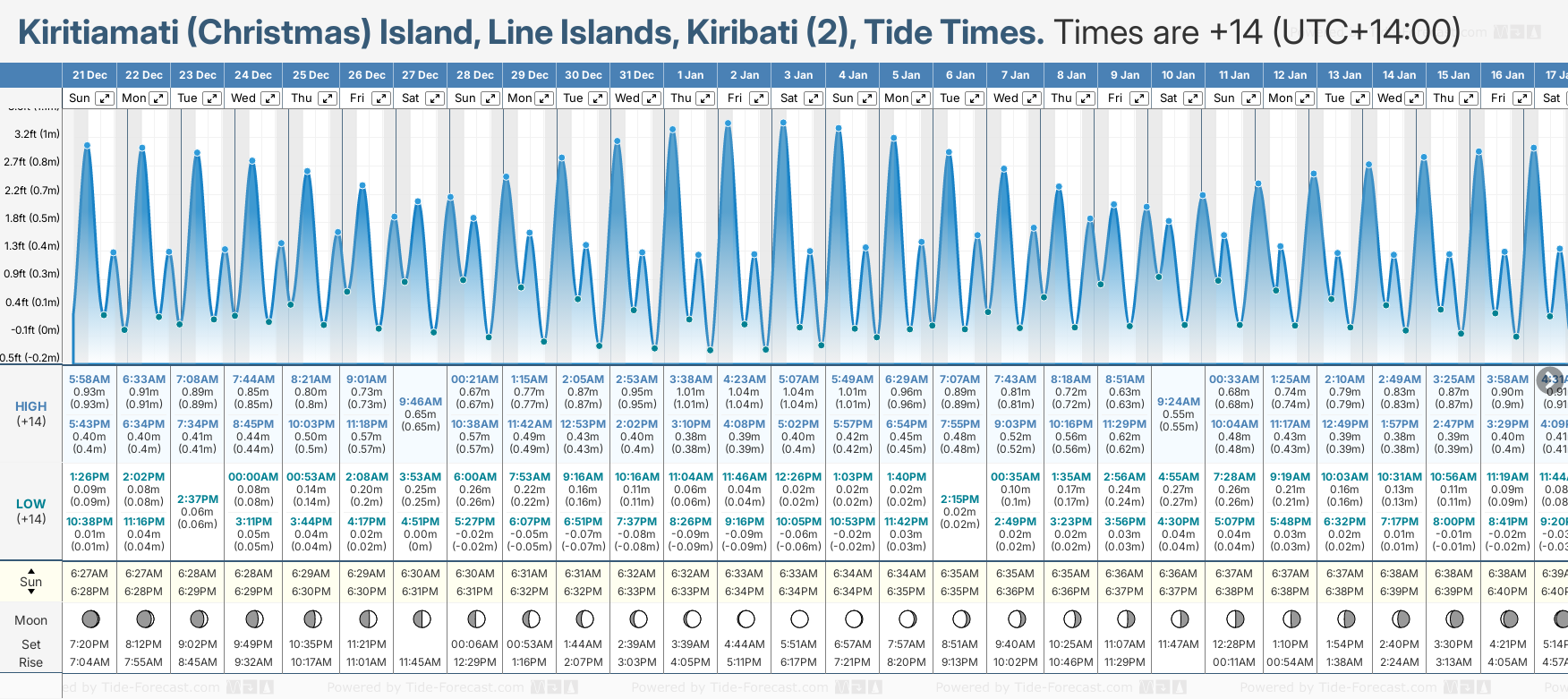 Tide chart for Kiritiamati (Christmas) Island, Line Islands (2)Showing low and high tide times for the next 30 days at Kiritiamati (Christmas) Island, Line Islands (2). Tide Times are +14 (UTC +14.0hrs).