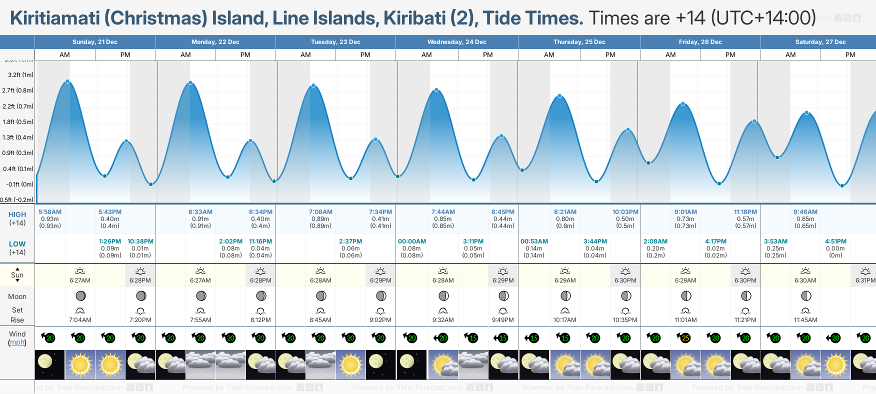 Tide Times are +14 (UTC +14.0hrs). Last Spring High Tide at Kiritiamati (Christmas) Island, Line Islands (2) was on Sun 21 Dec (height: 0.93m 3.1ft). Next high Spring Tide at Kiritiamati (Christmas) Island, Line Islands (2) will be on Fri 02 Jan (height: 1.04m 3.4ft).