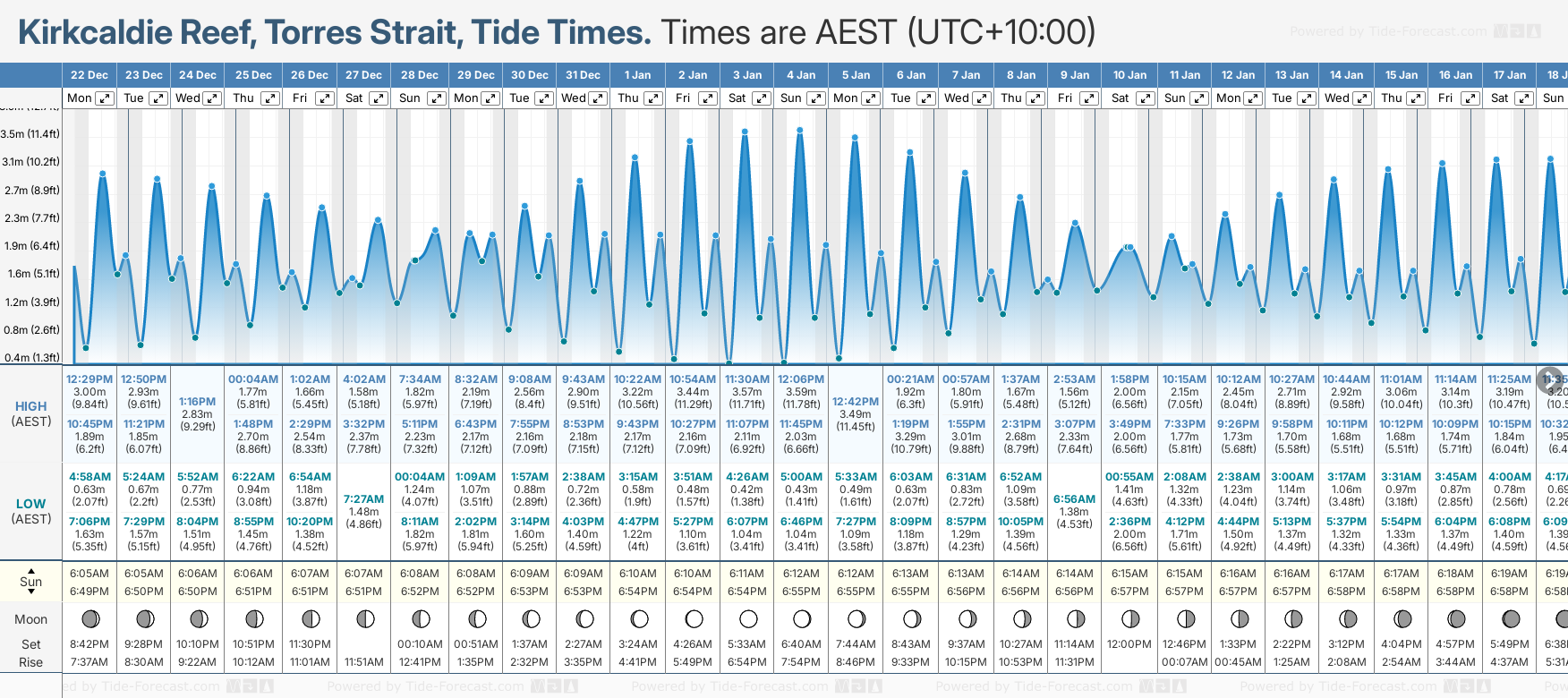 Tide Times are AEST (UTC +10.0hrs). Last Spring High Tide at Kirkcaldie Reef was on Sat 20 Dec (height: 3.08m 10.1ft). Next high Spring Tide at Kirkcaldie Reef will be on Sun 04 Jan (height: 3.59m 11.8ft).