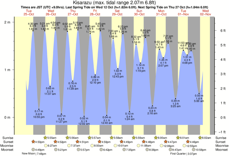 Tide Times are JST (UTC +9.0hrs). Last Spring High Tide at Kisarazu was on Sun 07 Dec (height: 1.86m 6.1ft). Next high Spring Tide at Kisarazu will be on Mon 22 Dec (height: 1.73m 5.7ft).