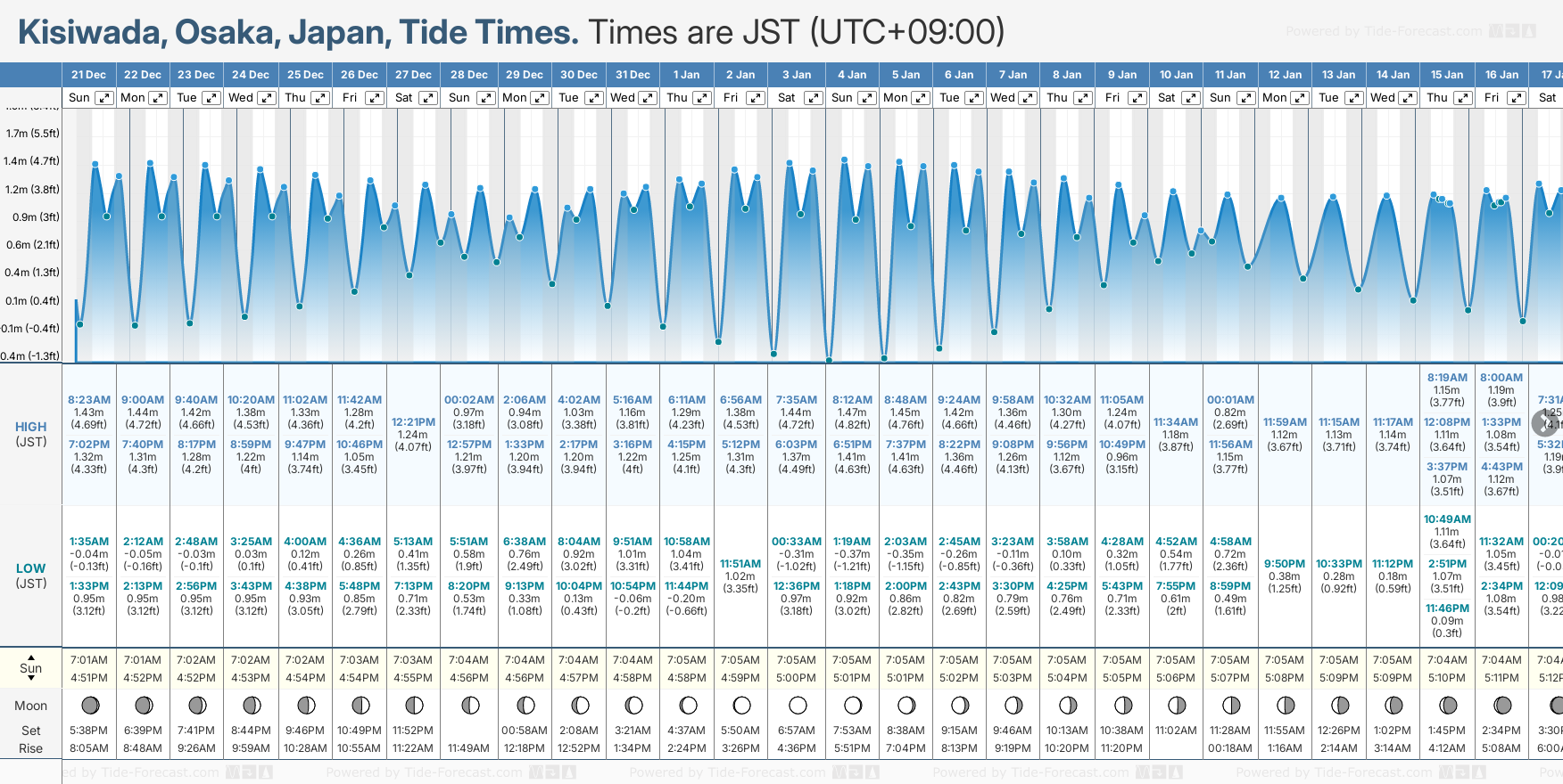 Kisiwada tide chart key: The tide chart above shows the height and times of high tide and low tide for Kisiwada, Osaka, Japan. The grey shading corresponds to nighttime hours between sunset and sunrise at Kisiwada.