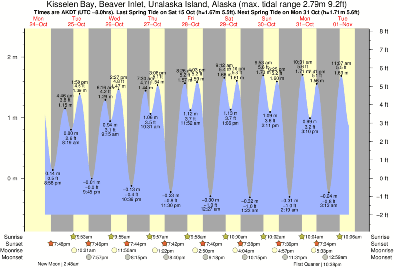 December and January Tide charts for Kisselen Bay, Beaver Inlet, Unalaska Island: The tide charts below show the height, time and date of high and low tides for the next 30 days.