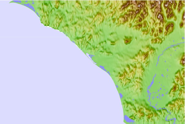 Use this relief map to navigate to tide stations, surf breaks and cities that are in the area of Kivalina, Alaska.