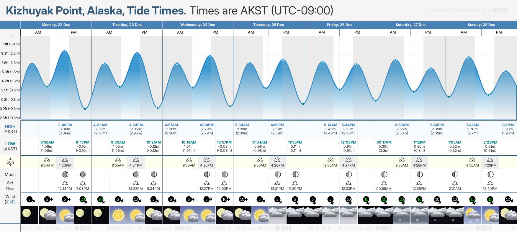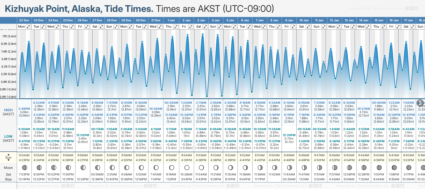 December and January Tide charts for Kizhuyak Point: The tide charts below show the height, time and date of high and low tides for the next 30 days.