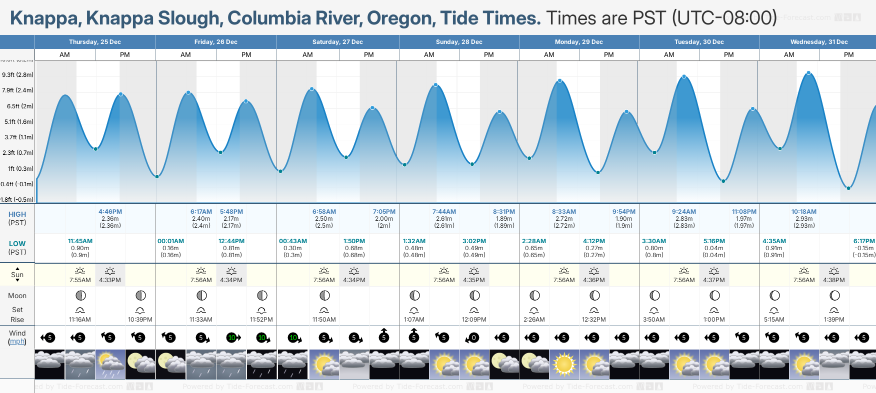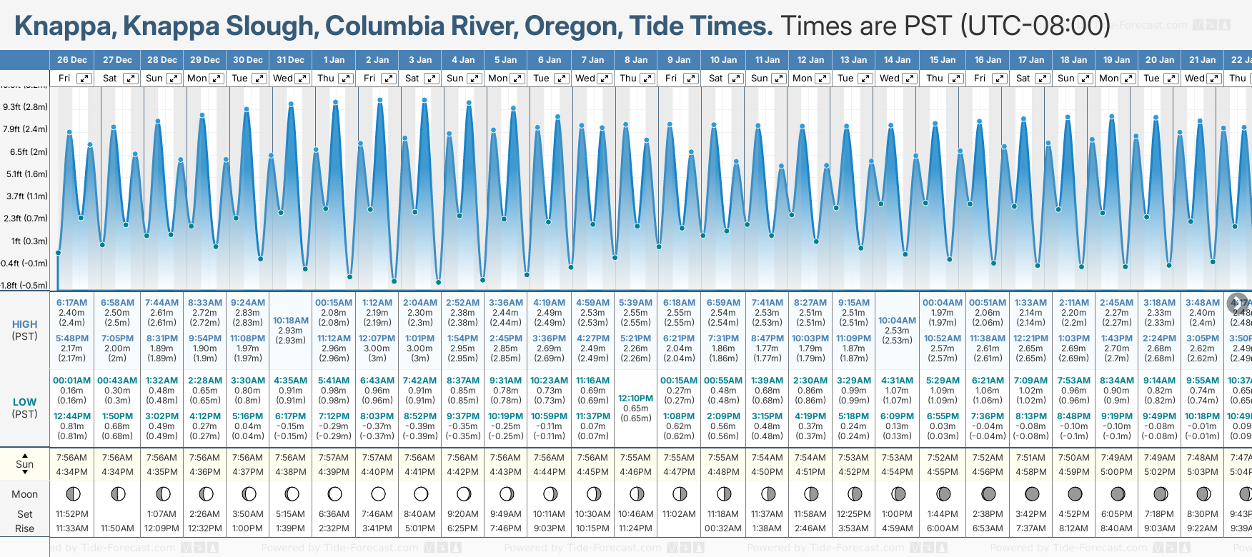 Tide chart for Knappa, Knappa Slough, Columbia RiverShowing low and high tide times for the next 30 days at Knappa, Knappa Slough, Columbia River. Tide Times are PST (UTC -8.0hrs).