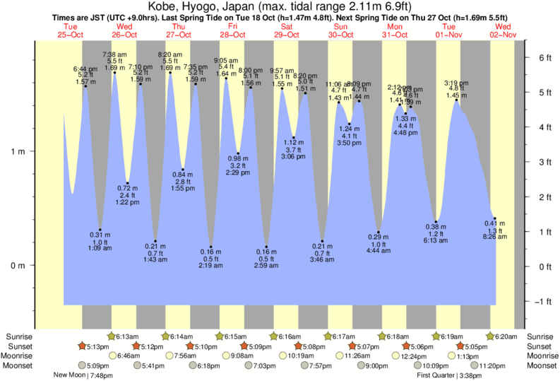 Tide Times are JST (UTC +9.0hrs). Last Spring High Tide at Kobe was on Fri 05 Dec (height: 1.58m 5.2ft). Next high Spring Tide at Kobe will be on Sun 21 Dec (height: 1.40m 4.6ft).