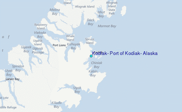 Use this relief map to navigate to tide stations, surf breaks and cities that are in the area of Kodiak, Port of Kodiak, Alaska.