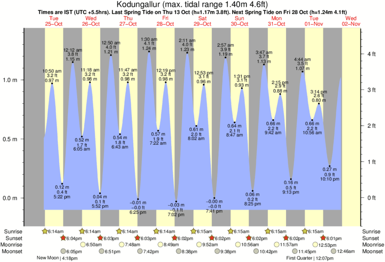 Tide Times are IST (UTC +5.5hrs). Last Spring High Tide at Kodungallur was on Sun 07 Dec (height: 1.29m 4.2ft). Next high Spring Tide at Kodungallur will be on Tue 23 Dec (height: 1.18m 3.9ft).