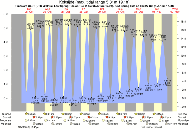 Tide Times are CET (UTC +1.0hrs). Last Spring High Tide at Koksijde was on Sat 06 Dec (height: 5.36m 17.6ft). Next high Spring Tide at Koksijde will be on Wed 24 Dec (height: 4.72m 15.5ft).