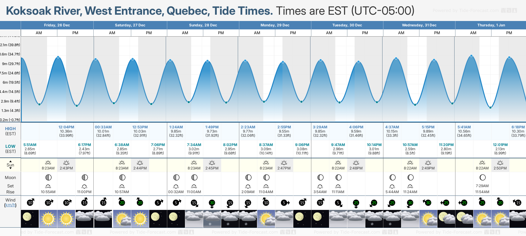 December and January Tide charts for Koksoak River, West Entrance: The tide charts below show the height, time and date of high and low tides for the next 30 days.