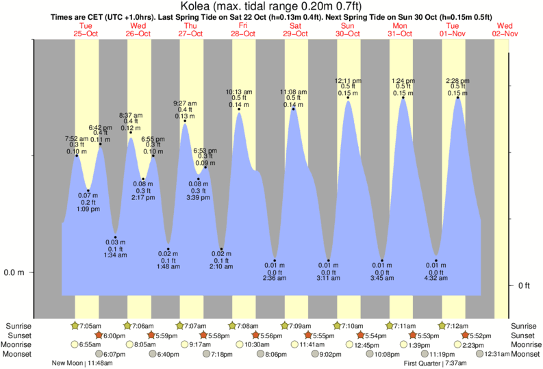 Tide Times are CET (UTC +1.0hrs). Last Spring High Tide at Kolea was on Mon 08 Dec (height: 0.18m 0.6ft). Next high Spring Tide at Kolea will be on Mon 22 Dec (height: 0.16m 0.5ft).