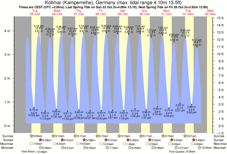 Tide Times are CET (UTC +1.0hrs). Last Spring High Tide at Kollmar (Kamperreihe) was on Mon 08 Dec (height: 3.82m 12.5ft). Next high Spring Tide at Kollmar (Kamperreihe) will be on Tue 23 Dec (height: 3.95m 13.0ft).