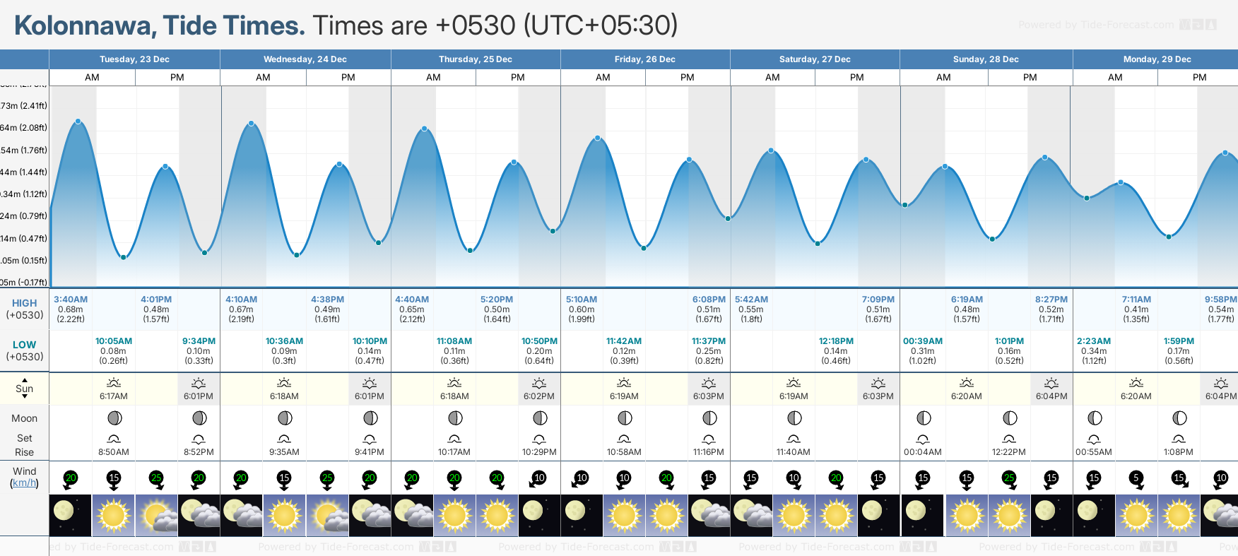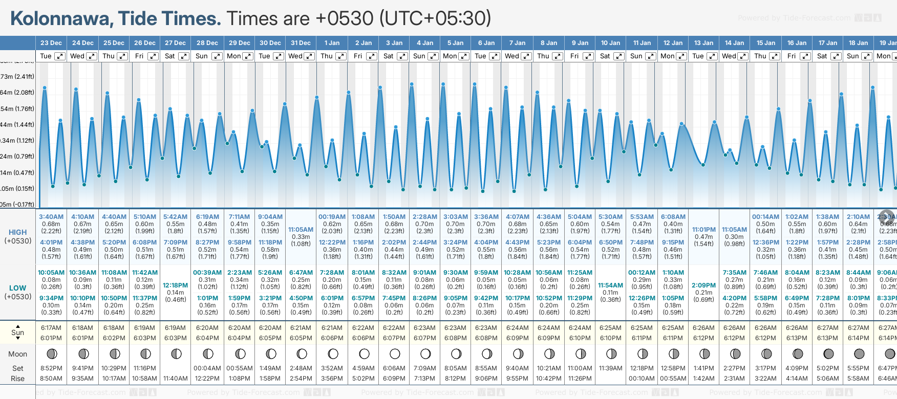 December and January Tide charts for Kolonnawa: The tide charts below show the height, time and date of high and low tides for the next 30 days.