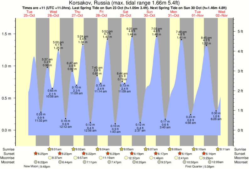 December and January Tide charts for Korsakov: The tide charts below show the height, time and date of high and low tides for the next 30 days.