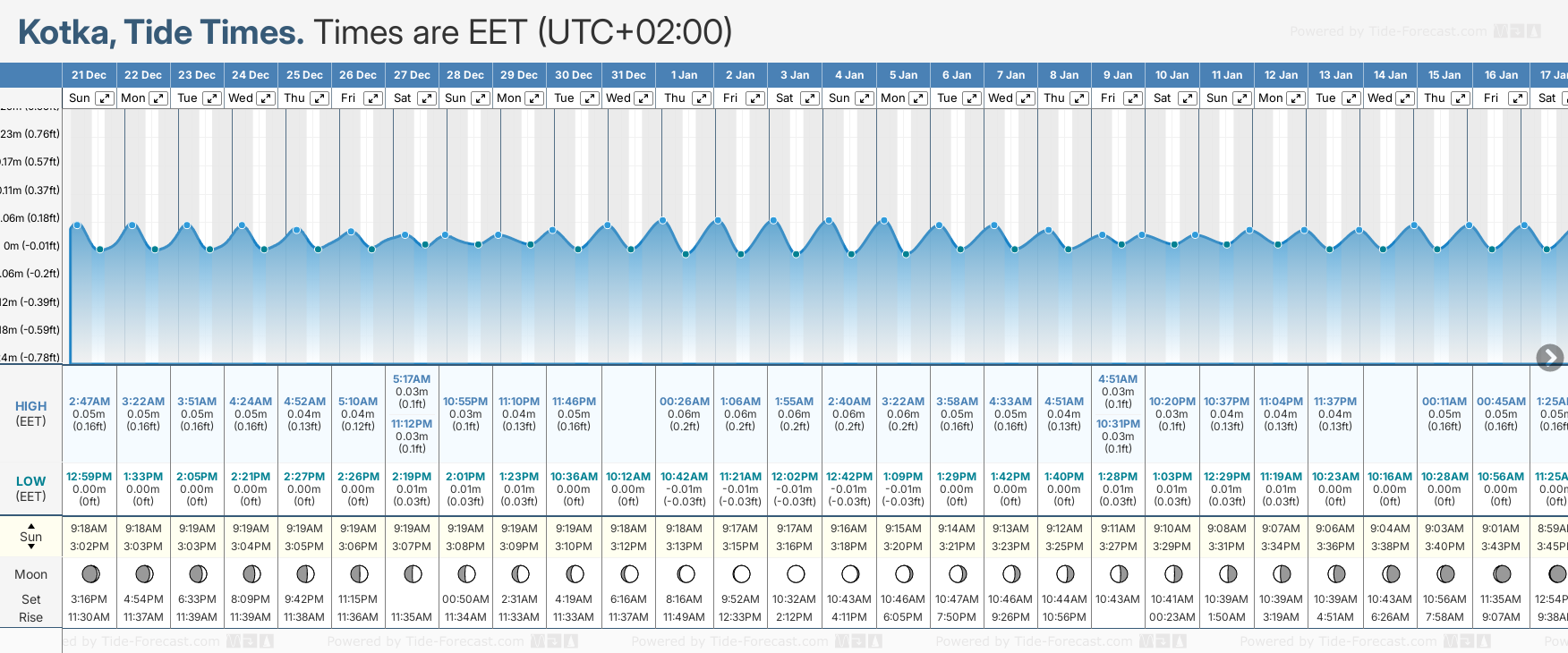 December and January Tide charts for Kotka: The tide charts below show the height, time and date of high and low tides for the next 30 days.