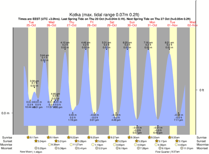 Tide Times are EET (UTC +2.0hrs). Last Spring High Tide at Kotka was on Wed 17 Dec (height: 0.05m 0.2ft). Next high Spring Tide at Kotka will be on Thu 01 Jan (height: 0.06m 0.2ft).
