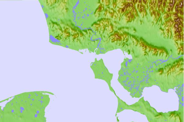 Use this relief map to navigate to tide stations, surf breaks and cities that are in the area of Kotzebue, Kotzebue Sound, Alaska.