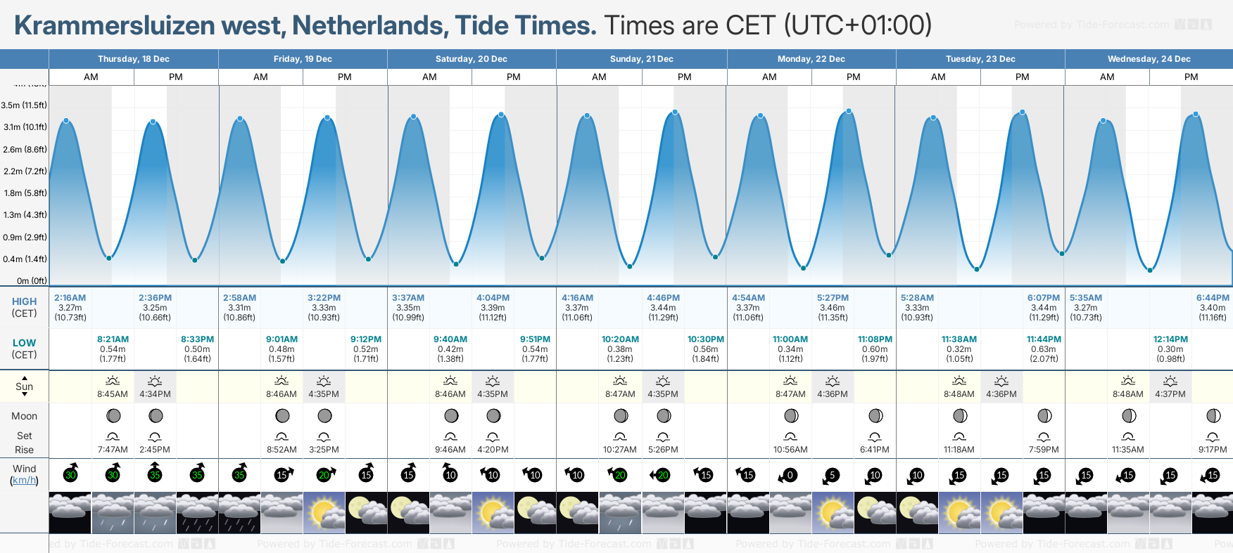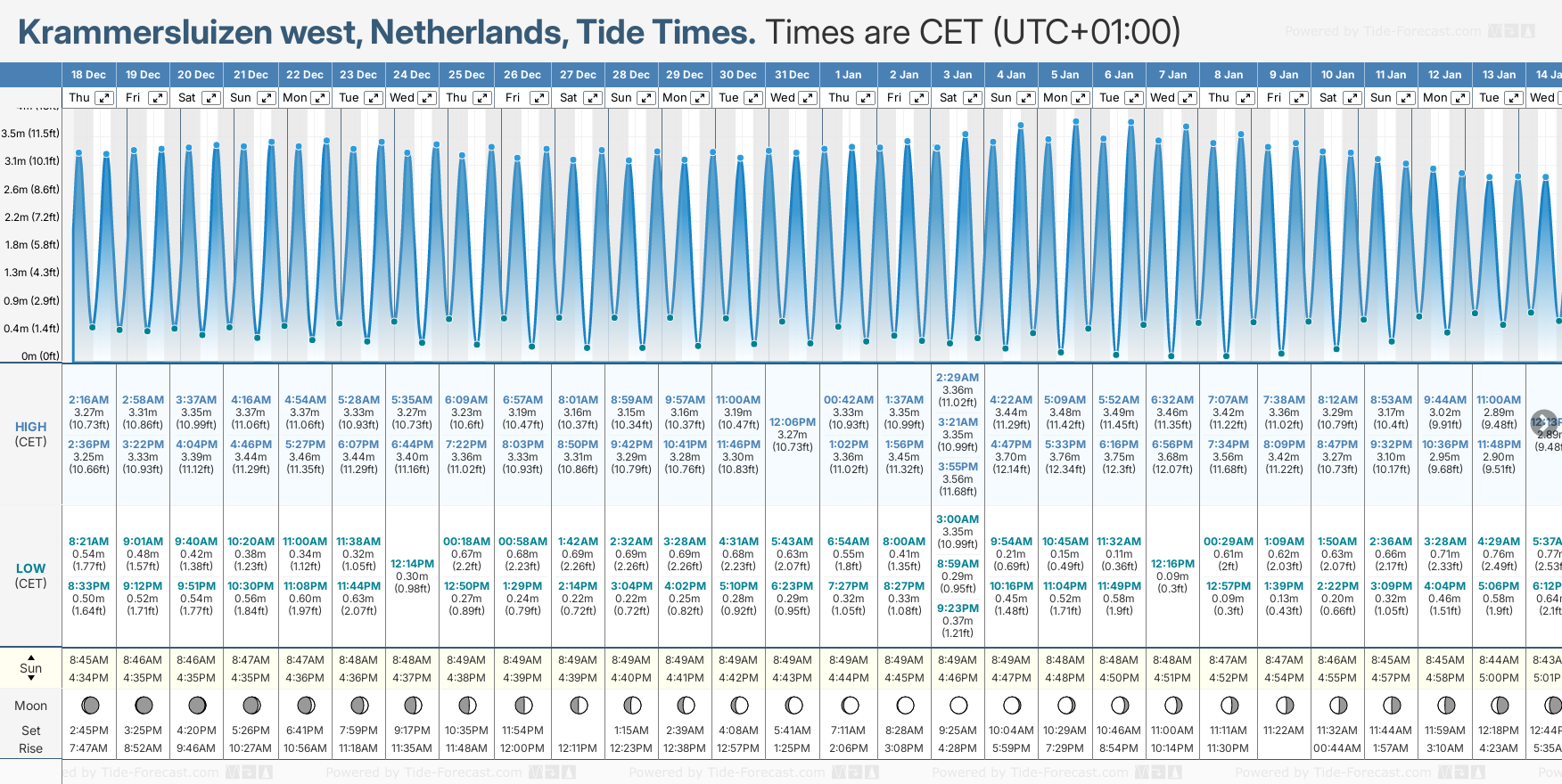 December and January Tide charts for Krammersluizen west: The tide charts below show the height, time and date of high and low tides for the next 30 days.