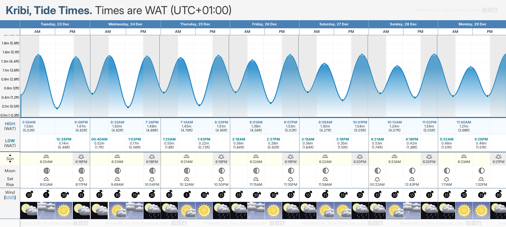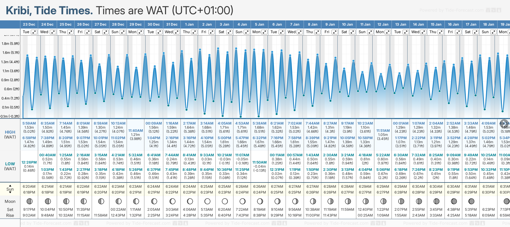December and January Tide charts for Kribi: The tide charts below show the height, time and date of high and low tides for the next 30 days.