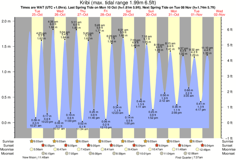 Tide Times are WAT (UTC +1.0hrs). Last Spring High Tide at Kribi was on Thu 04 Dec (height: 1.81m 5.9ft). Next high Spring Tide at Kribi will be on Mon 22 Dec (height: 1.54m 5.1ft).