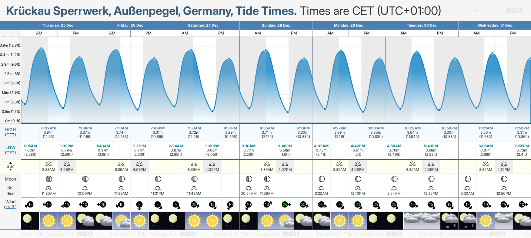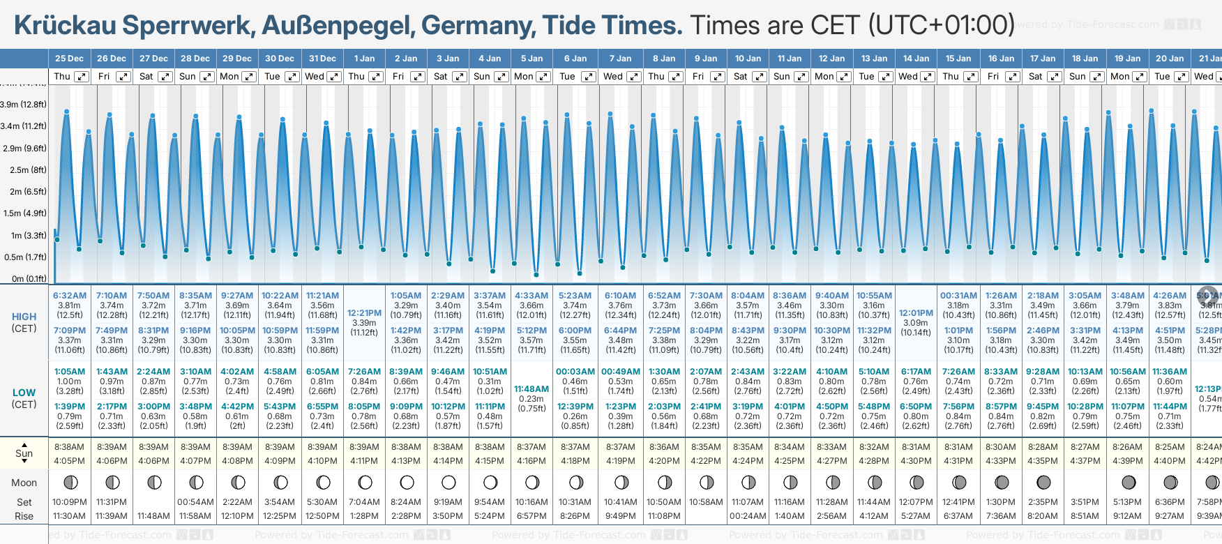 Tide Times are CET (UTC +1.0hrs). Last Spring High Tide at Kruckau Sperrwerk, Aussenpegel was on Tue 23 Dec (height: 3.95m 13.0ft). Next high Spring Tide at Kruckau Sperrwerk, Aussenpegel will be on Wed 07 Jan (height: 3.76m 12.3ft).