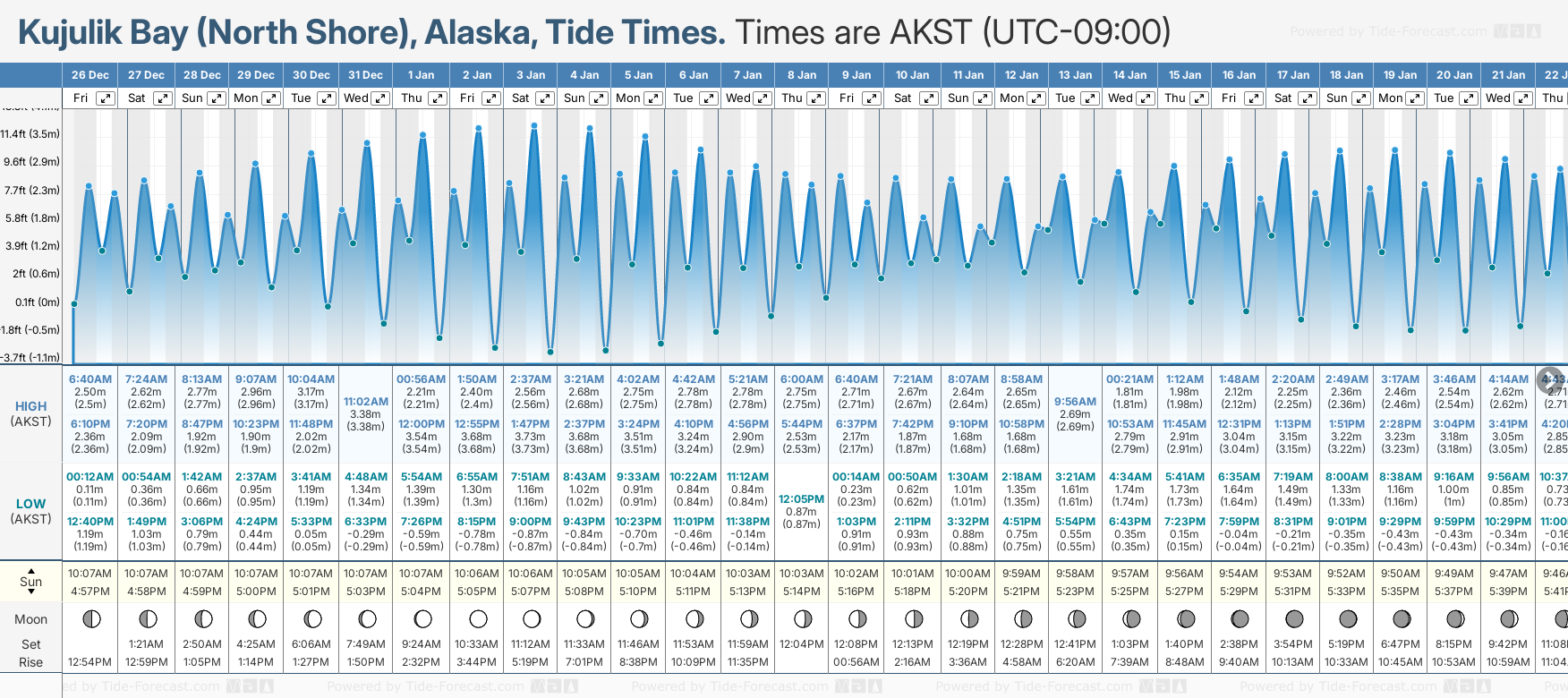 December and January Tide charts for Kujulik Bay (North Shore): The tide charts below show the height, time and date of high and low tides for the next 30 days.