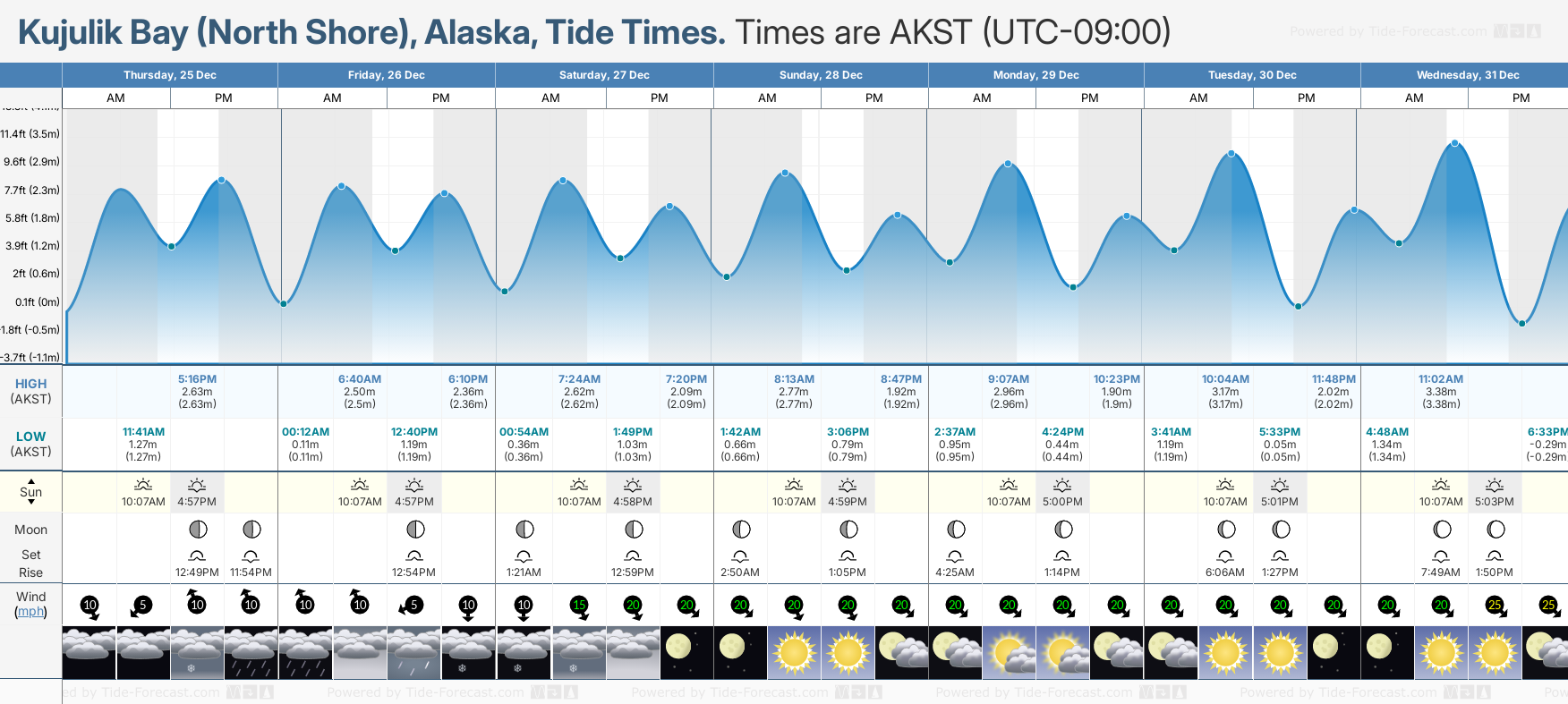 Tide chart for Kujulik Bay (North Shore)Showing low and high tide times for the next 30 days at Kujulik Bay (North Shore). Tide Times are AKST (UTC -9.0hrs).