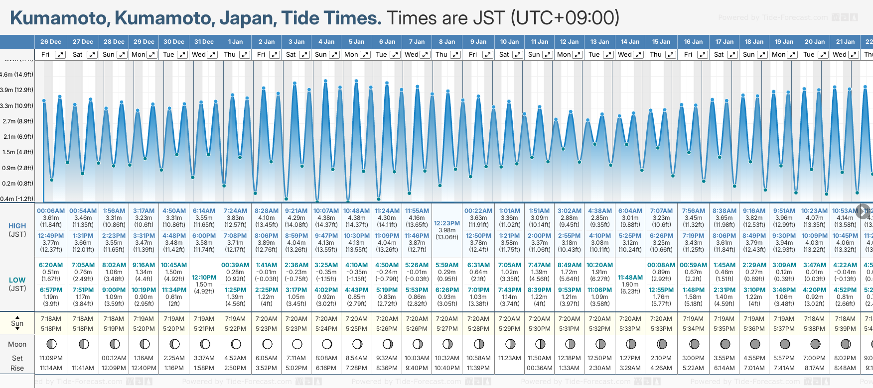Tide Times are JST (UTC +9.0hrs). Last Spring High Tide at Kumamoto was on Mon 22 Dec (height: 3.96m 13.0ft). Next high Spring Tide at Kumamoto will be on Sun 04 Jan (height: 4.38m 14.4ft).