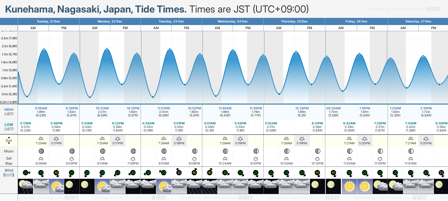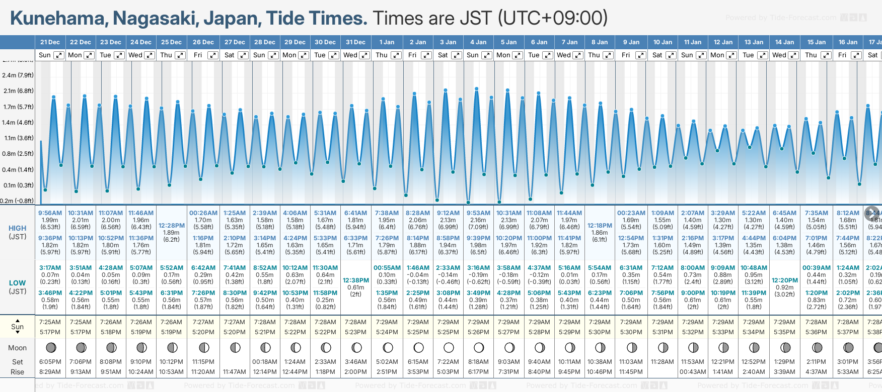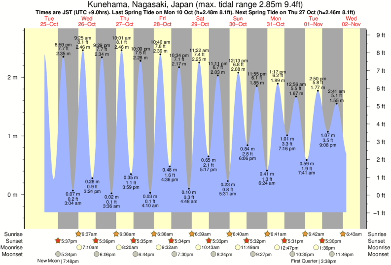 Kunehama tide chart key: The tide chart above shows the height and times of high tide and low tide for Kunehama, Nagasaki, Japan. The grey shading corresponds to nighttime hours between sunset and sunrise at Kunehama.