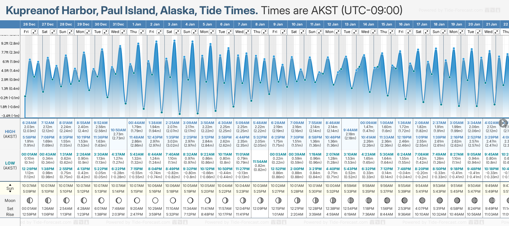 December and January Tide charts for Kupreanof Harbor, Paul Island: The tide charts below show the height, time and date of high and low tides for the next 30 days.
