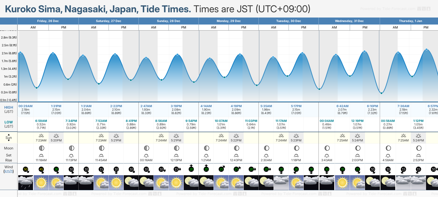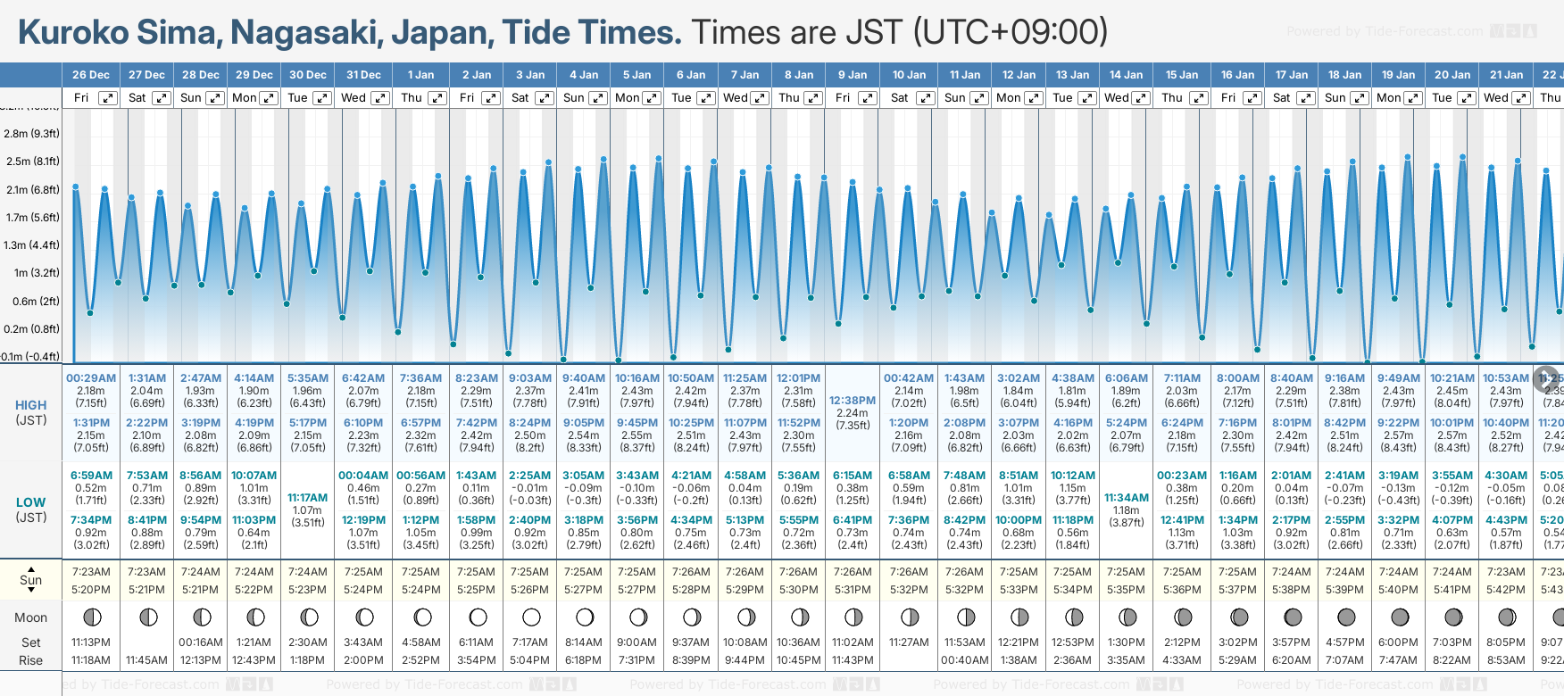 December and January Tide charts for Kuroko Sima: The tide charts below show the height, time and date of high and low tides for the next 30 days.