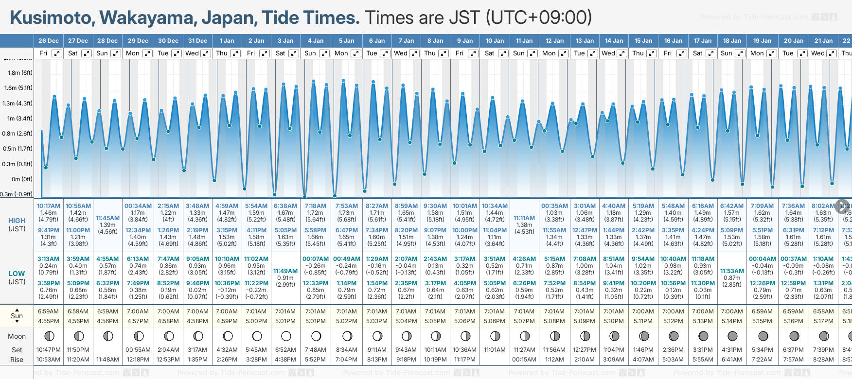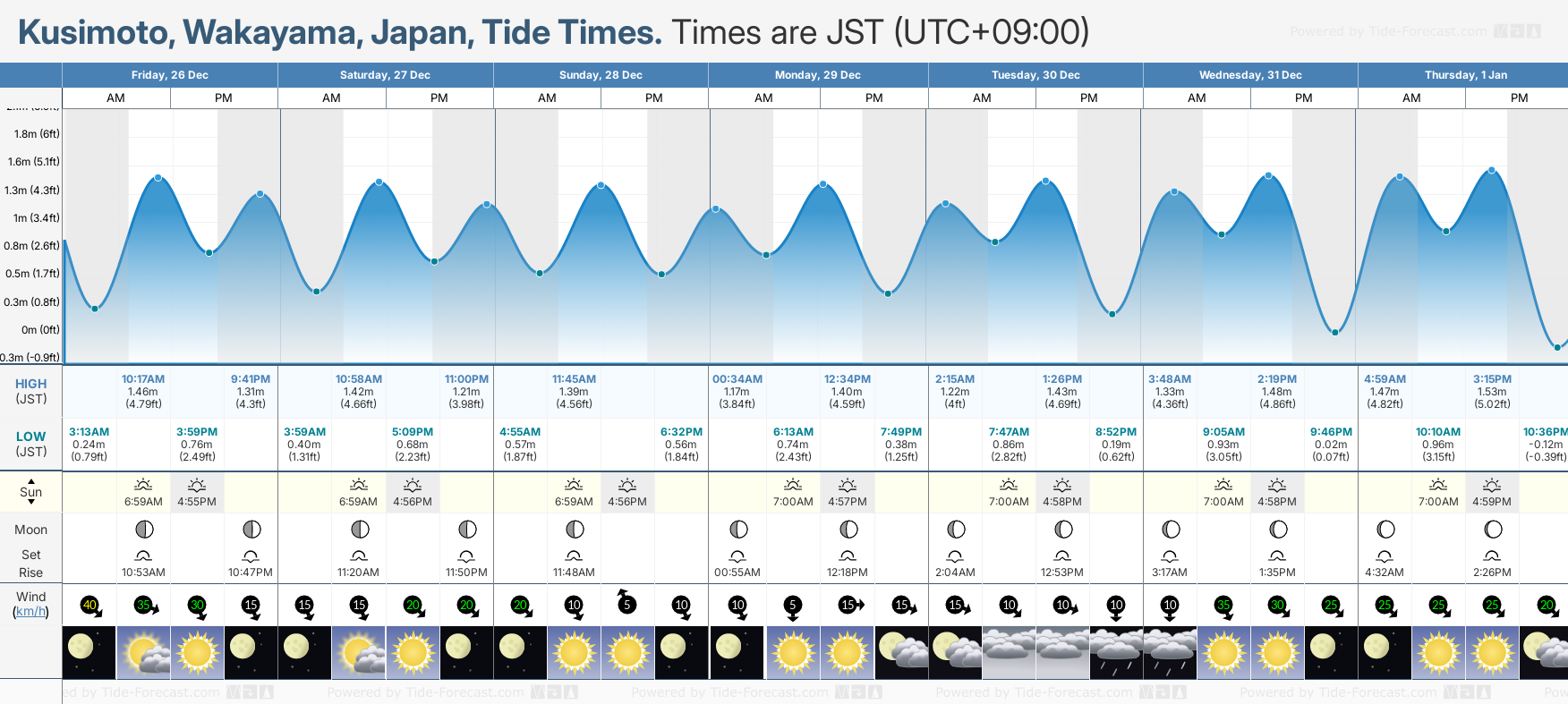 December and January Tide charts for Kusimoto: The tide charts below show the height, time and date of high and low tides for the next 30 days.