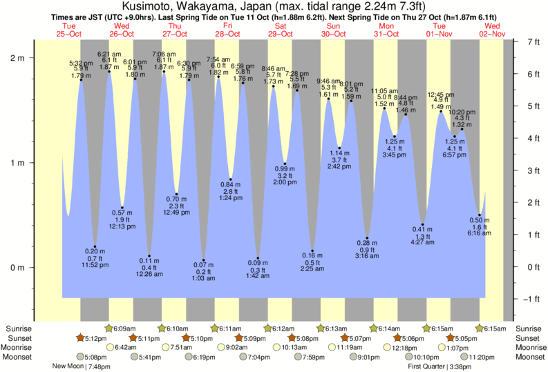 Tide Times are JST (UTC +9.0hrs). Last Spring High Tide at Kusimoto was on Sat 06 Dec (height: 1.77m 5.8ft). Next high Spring Tide at Kusimoto will be on Mon 05 Jan (height: 1.73m 5.7ft).