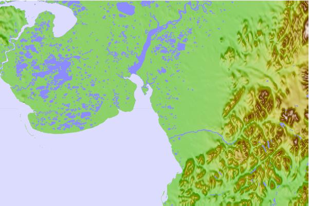 Use this relief map to navigate to tide stations, surf breaks and cities that are in the area of Kuskokwak Creek entrance, Alaska.